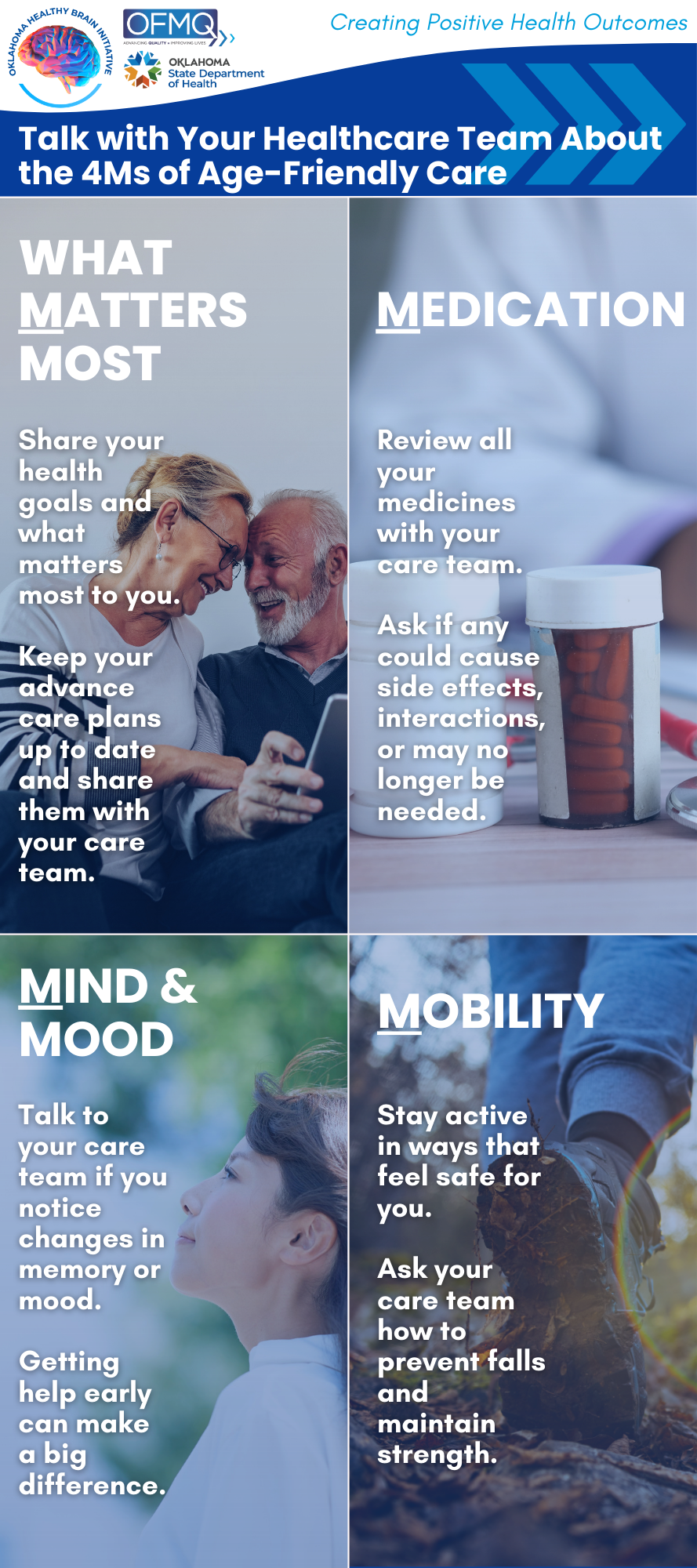 OFMQ supports the Oklahoma State Department of Health in advancing Age-Friendly Communities by partnering with rural hospitals to build a sustainable Age-Friendly ecosystem. Our team facilitates implementation of the Age-Friendly 4Ms framework and provides hands-on technical assistance to help rural hospitals adopt best practices, strengthen care delivery, and achieve Age-Friendly Health Systems goals.